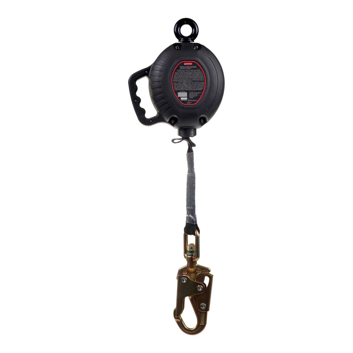 KStrong® BRUTE™ 11′ Web SRL with High Impact Strength Polymer Housing with Built-in Handle, swivel eye at anchorage end, other end with load indicator swivel snap hook. Includes one (1) installation carabiner (ANSI)