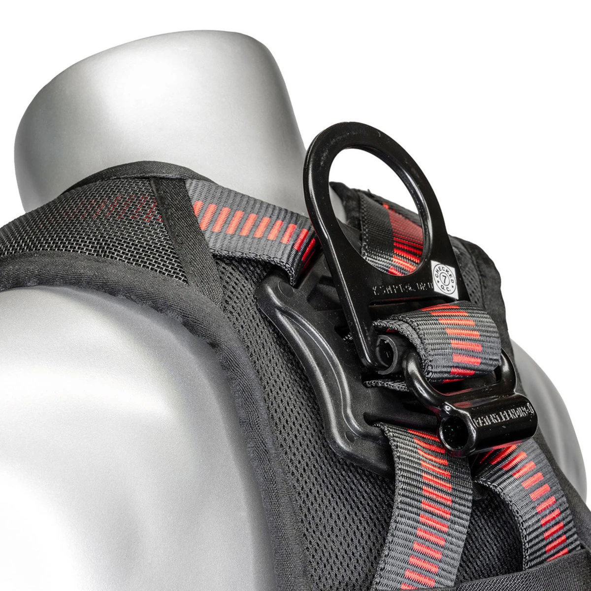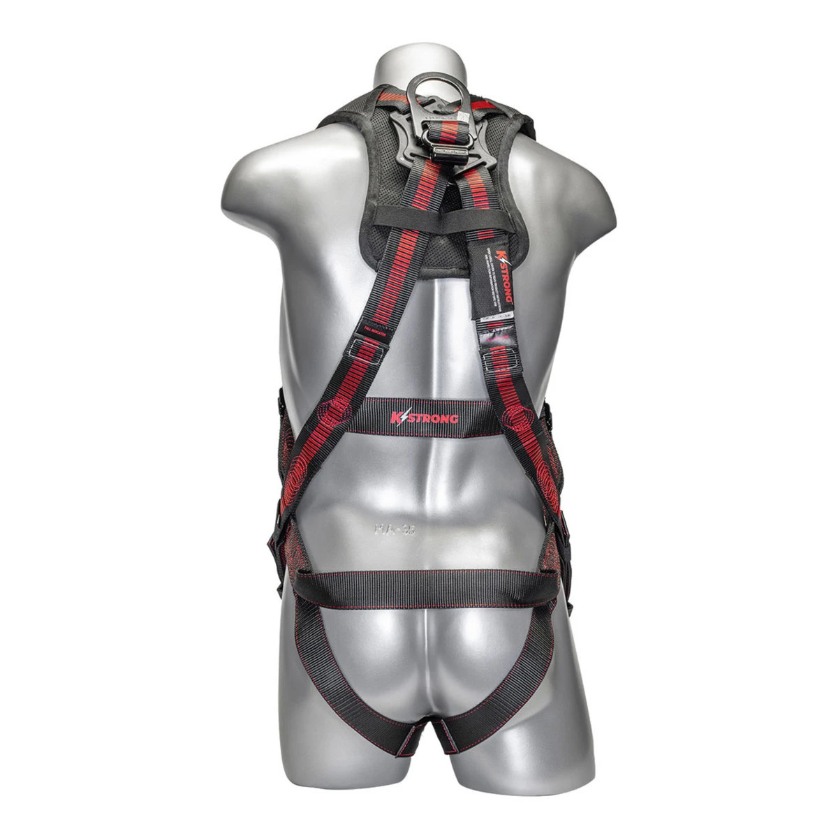 This is the K-Strong Kapture series Elite+ 5-Point full-body harness (FBH) with an enhanced dorsal D-ring and all-black fittings. The Elite+ FBH is made from high-tenacity polyester and comes equipped with tongue buckle legs, grommeted let straps, shoulder pads, one back D-Ring attachment for fall arrest, and quick-connect fittings.