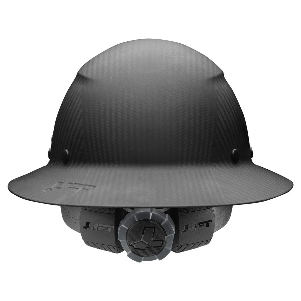 The LIFT DAX Carbon Fiber Hard Hat is a full brim, carbon fiber reinforced resin hard hat offering a 6 point suspension system for superior comfort and impact protection. It features an innovative synthetic leather comfort dome and an over-sized ratcheting fitment dial that makes adjustment easy even while wearing gloves. Each Dax hard hat carbon fiber shell is hand laid giving it a unique, one of a kind appearance. The LIFT DAX Carbon Fiber Hard Hat weighs in at an average 315g grams without suspension system. With suspension it weighs on an average of 460 grams.