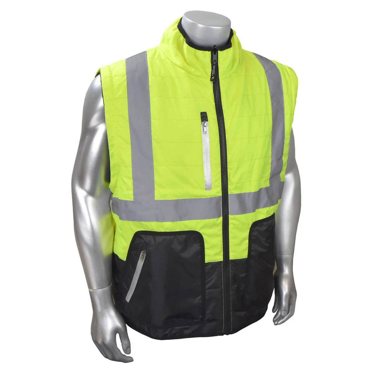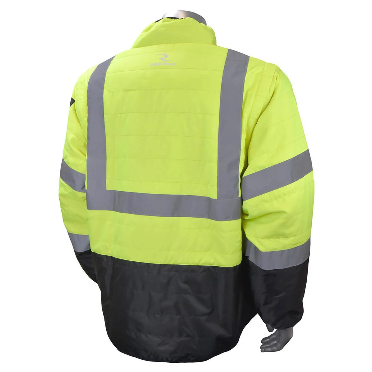 The Radians Quilted Reversible Jacket w/ Zip-Off Sleeves – SJ510-3ZGS is an all purpose, 4 in 1 vest/jacket hybrid. Zip off the sleeves when its warmer or keep them on for enduring the cold. It is made of quilted polyfil ripstop with heavy duty zippers for durability. You can choose to wear the high visibility yellow side or the charcoal grey side, both having multiple pockets for storage.