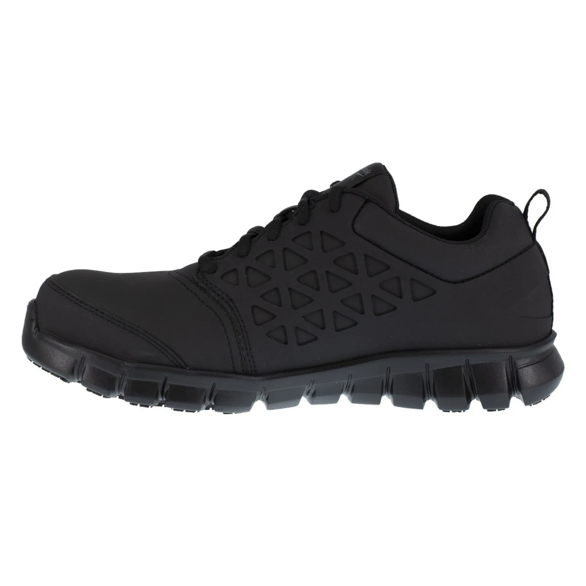 Reebok’s Men’s Sublite Cushion Work shoe achieves maximum lightness and flexibility. The all black design creates a classic look for your everyday wear. This composite toe athletic work shoe is designed with rubber pads that provide traction at heel strike and forefoot takeoff while minimizing weight. With a MemoryTech Massage footbed that adapts to the unique contours of your foot and an EXOFUSE upper for lightweight flexibility and water resistance, you won’t have to worry about protection on the job. For your safety, this shoe features a slip resistant cover and has an electrical hazard protection. With deep flex grooves, the Sublite foam midsole reduces weight and allows for greater range of motion. The Sublite Cushion meets ASTM F2413 standards.
